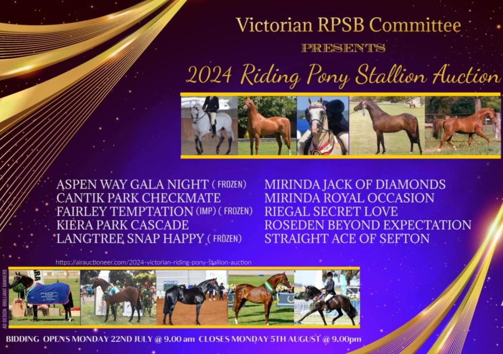 An exciting little buzz within our Victorian Committee at the moment, this is mainly thanks to the generosity of some Victorian Stallion Owners for bringing our ideas to fruition for fellow members.We are running a Riding Pony Stallion Tender, where all profits are going back into show sponsorship and divided by the following – 30% Pageant at The Park (December) 50% RPOTY (January), 10% Foal and Youngstock Show in Tatura and 10% Newcomer Scheme. The tender profits will be used to subside entry fees at the above-mentioned shows and for prize vouchers. In addition, we encourage recognition given to the breeders of the winning horses at the above-mentioned shows (it must be bred in Victoria or by a Victorian based stallion)All details including Terms & Conditions, of the tender will be undertaken via Air Auctioneer site 2024 Victorian Riding Pony Stallion Auction | AirAuctioneer. This won’t be live until Monday 22nd July 9:00 am & will close Monday 5th August 9:00pm.